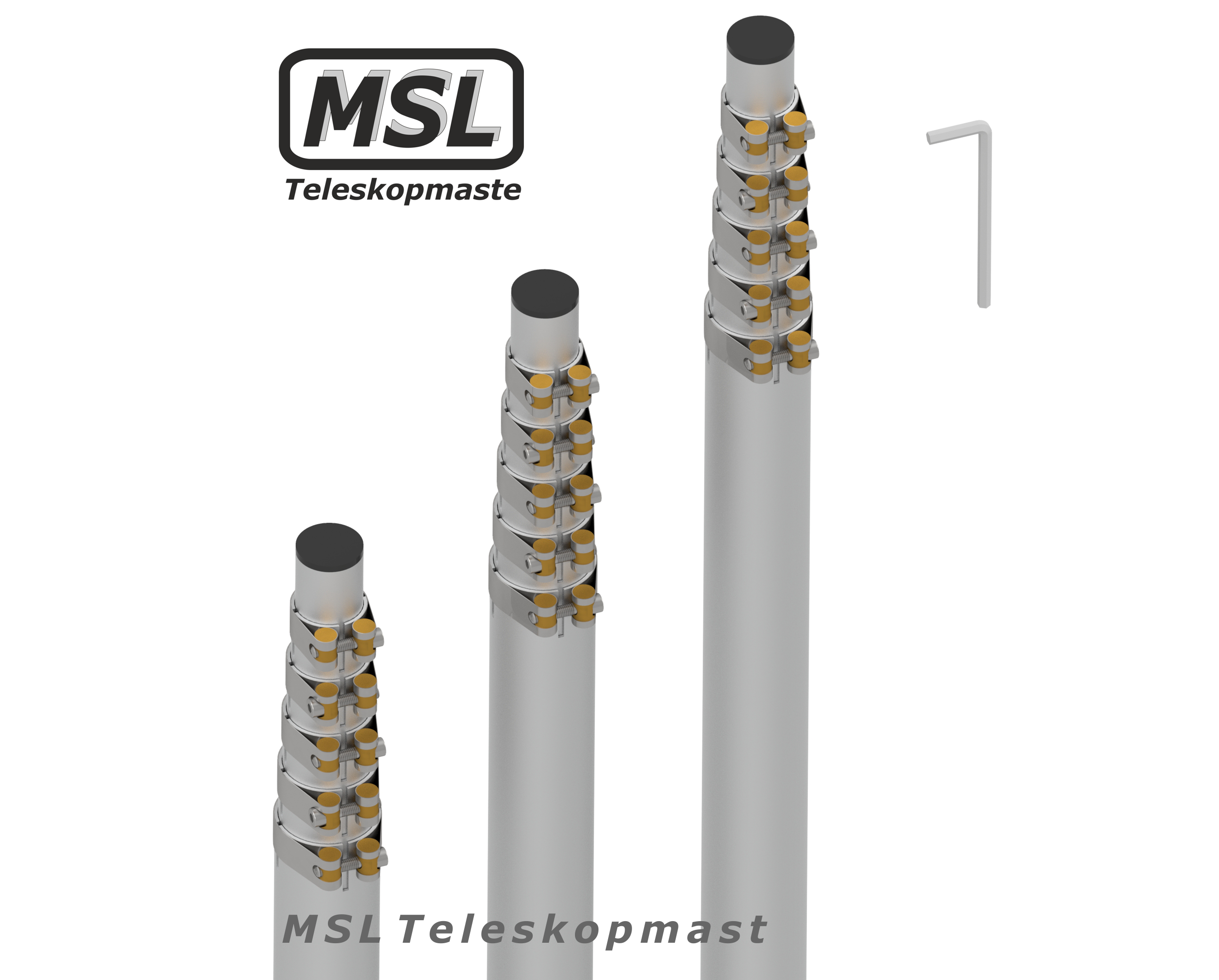 Die Schiebemaste bestehen aus mehreren ineinander gesteckten und einseitig geschlitzten Aluminiumrohren. Diese können maximal bis zur angebrachten Markierung per Hand ausgeschoben werden. Durch die stabilen Klemmschellen werden die ausgeschobenen Rohre kraftschlüssig arretiert.